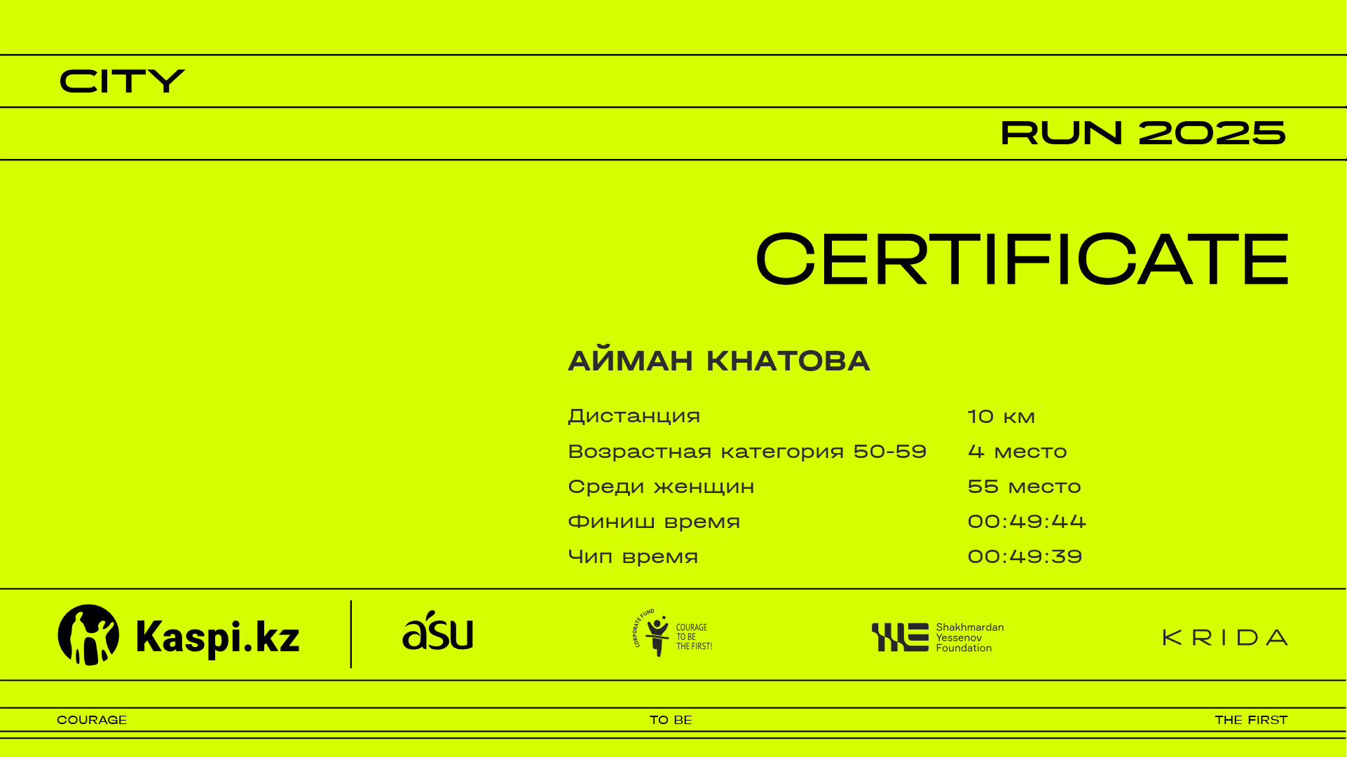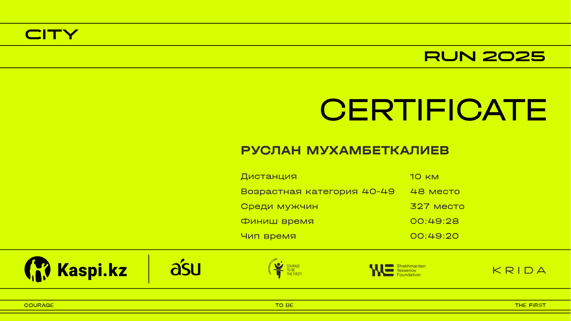| 388 | Yernar Altynbekov | ![]() | Алматы | 1932 | 00:12:50 | 00:21:44 | 00:31:22 | 00:41:11 | 00:48:36 | 00:49:47 | 00:49:37 | Скачать |