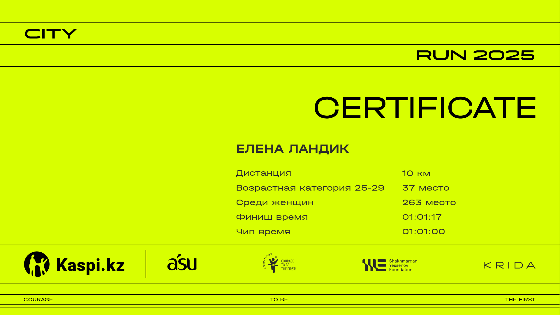 | 1837 | Дарья Ельшина | ![]() | Алматы | 102 | 00:23:10 | 00:39:32 | 00:55:58 | 01:12:10 | 01:24:35 | 01:26:20 | 01:25:01 | Скачать |
