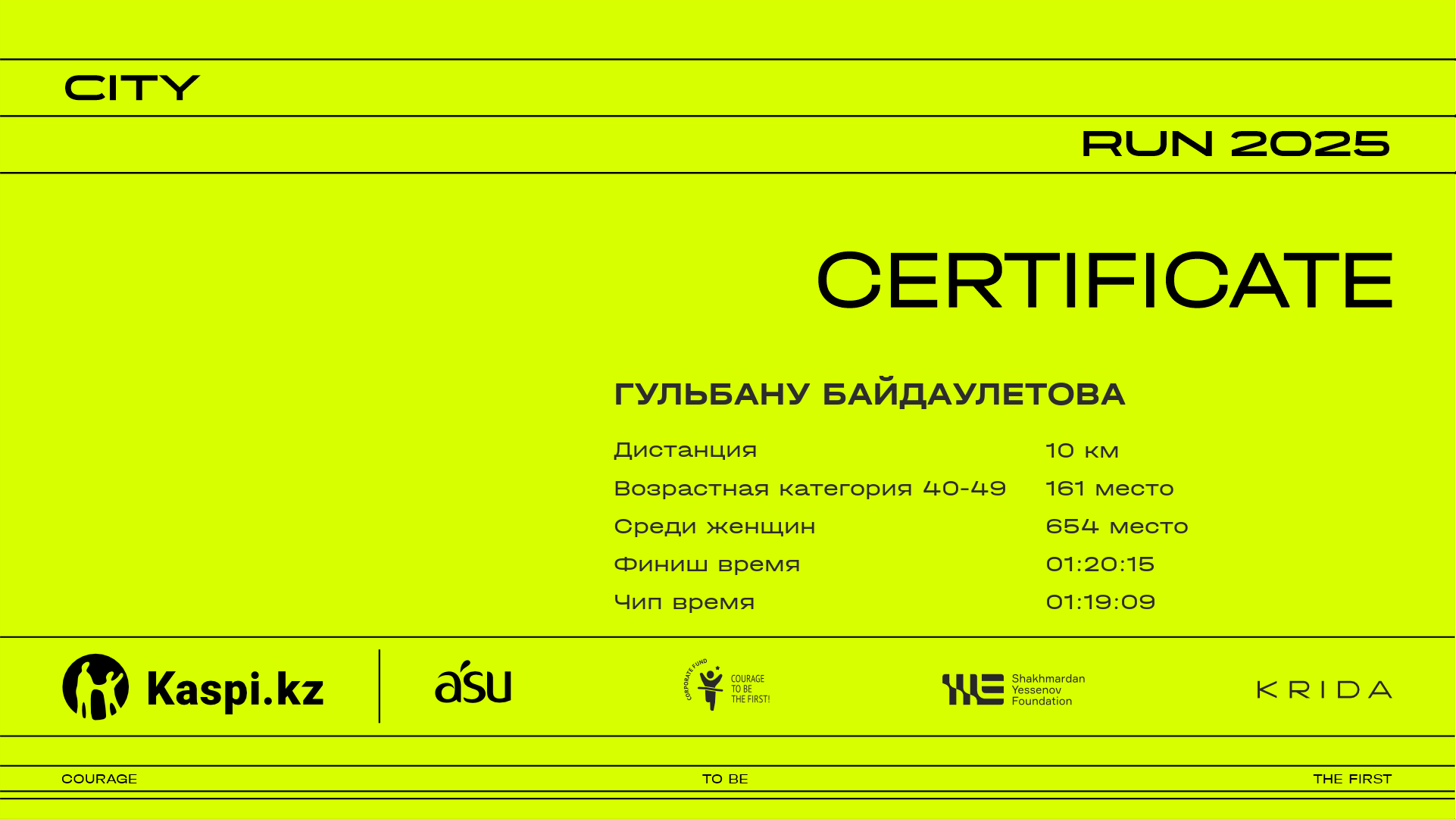 | 1712 | Гульназ Нуркен | ![]() | Астана | 2478 | 00:20:03 | 00:33:55 | 00:50:10 | 01:05:24 | 01:17:28 | 01:18:52 | 01:17:56 | Скачать |