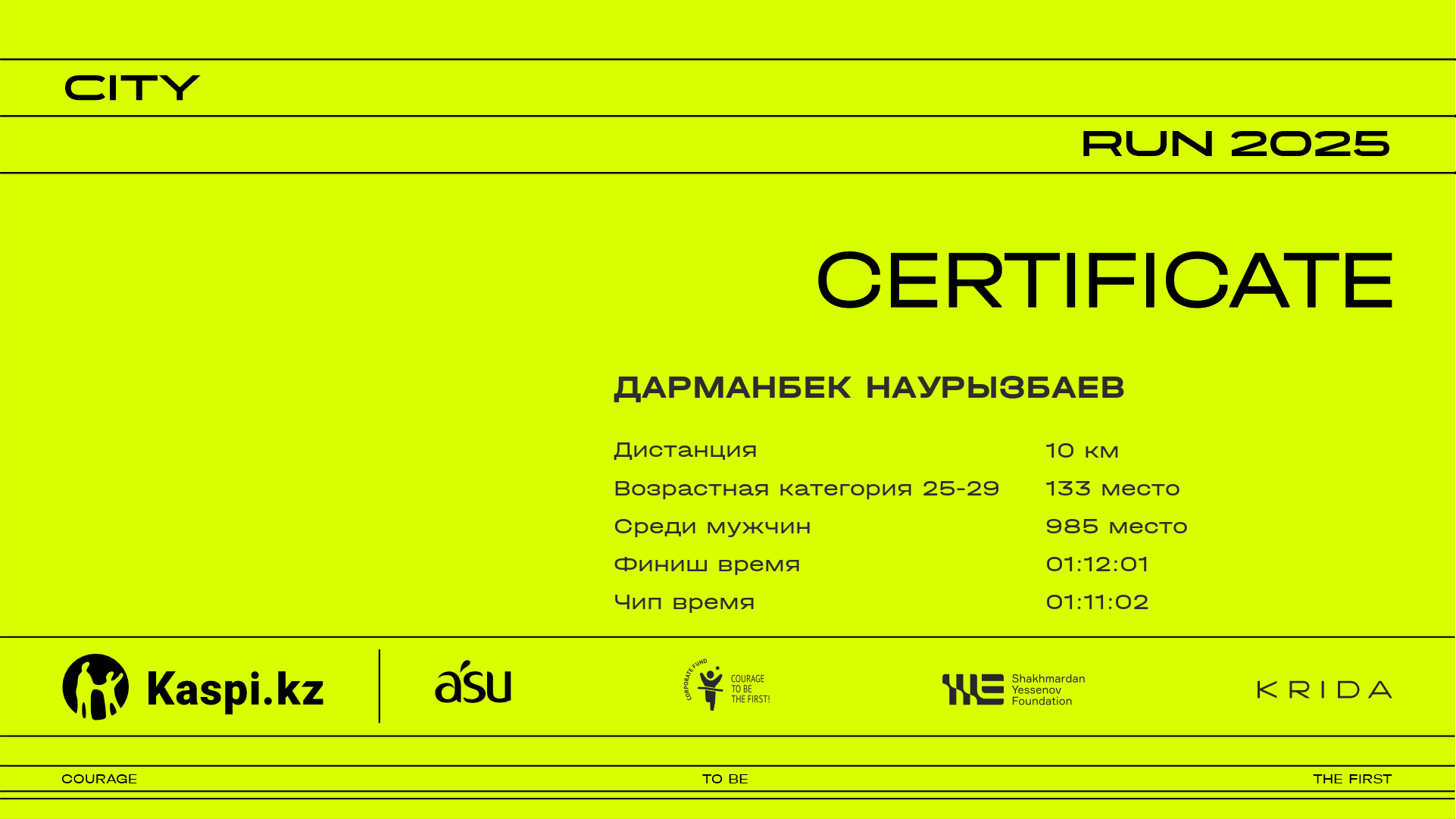 | 1414 | Zhanybek Zhiyembayev | ![]() | Almaty | 1608 | 00:17:39 | 00:30:42 | 00:44:59 | 00:58:29 | 01:08:34 | 01:10:00 | 01:09:20 | Скачать |