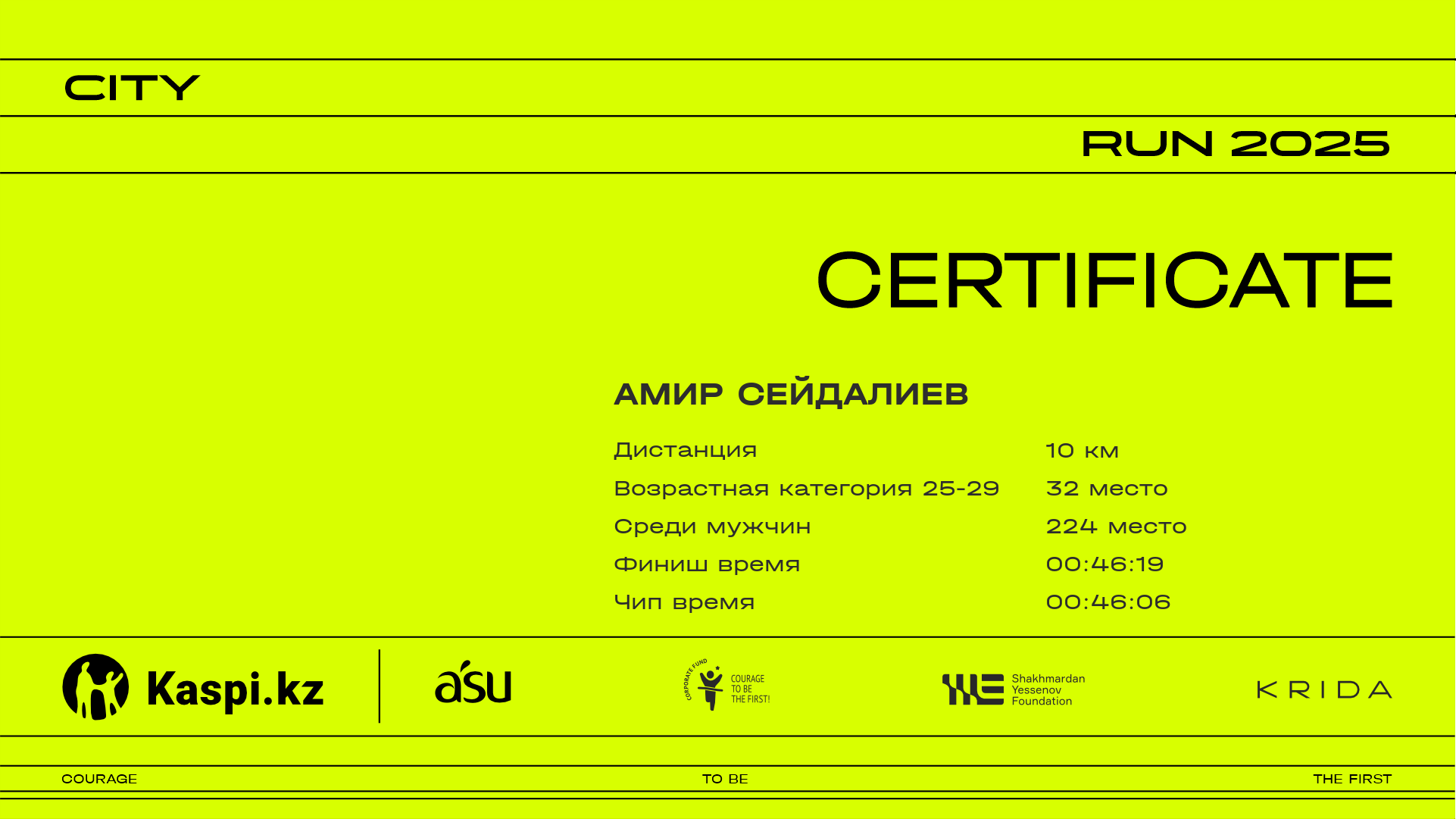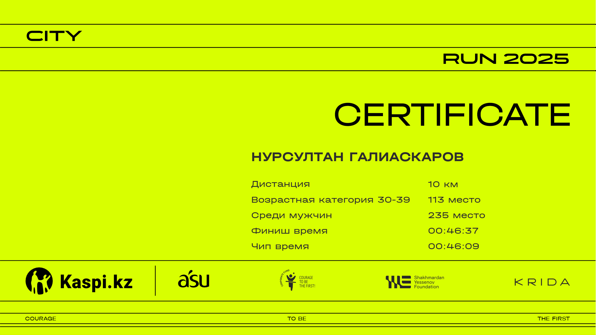 | 254 | Ruslan Dossayev | ![]() | Алматы | 1942 | 00:11:29 | 00:19:40 | 00:28:49 | 00:38:15 | 00:45:21 | 00:46:18 | 00:46:10 | Скачать |