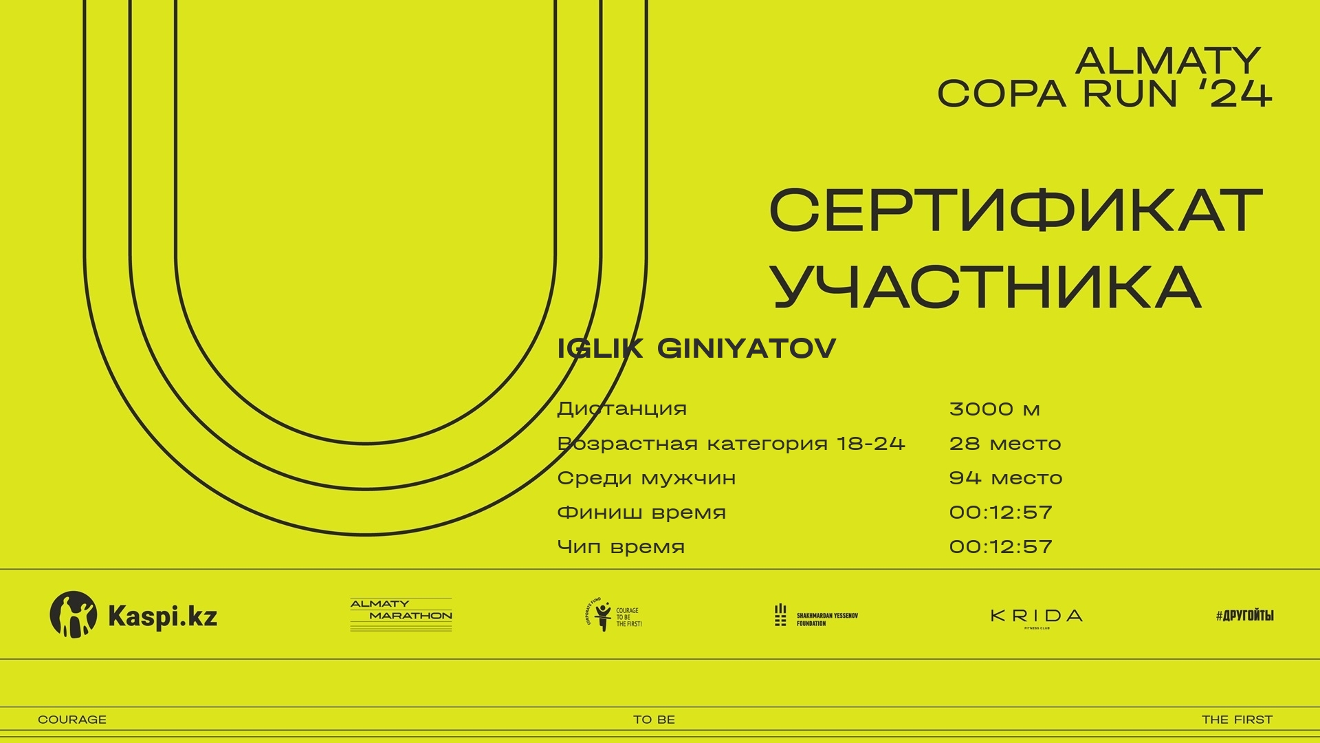| Место | Участник | Страна | Город | Номер | Финиш | Сертификат |