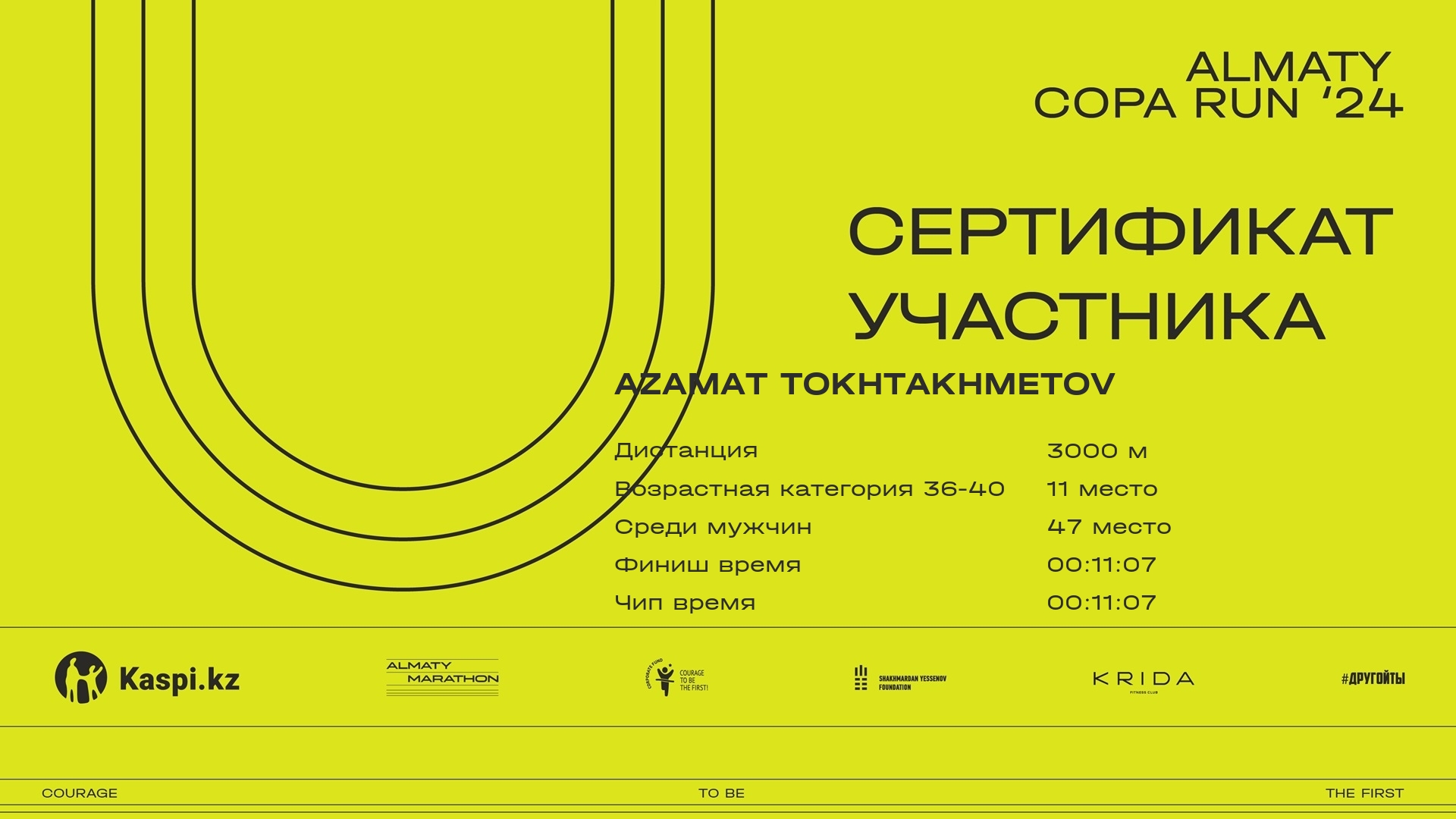 | 49 | Azamat Tokhtakhmetov | ![]() | Алматы | 459 | 00:11:07.5 | Скачать |
