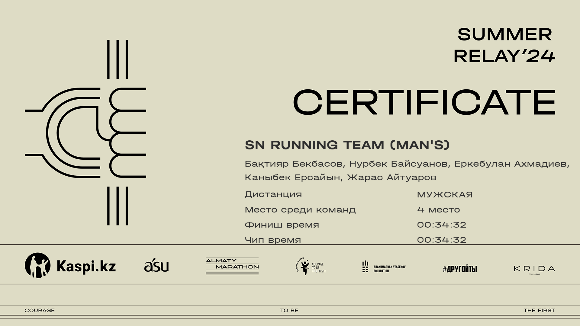| 4 | SN running team (man's): Бақтияр Бекбасов, Нурбек Байсуанов, Еркебулан Ахмадиев, Каныбек Ерсайын, Жарас Айтуаров |  | Алматы | 19 | 00:06:36.05 | 00:07:05.90 | 00:07:07.03 | 00:06:40.92 | 00:34:32.20 | 00:34:32.20 | Скачать |