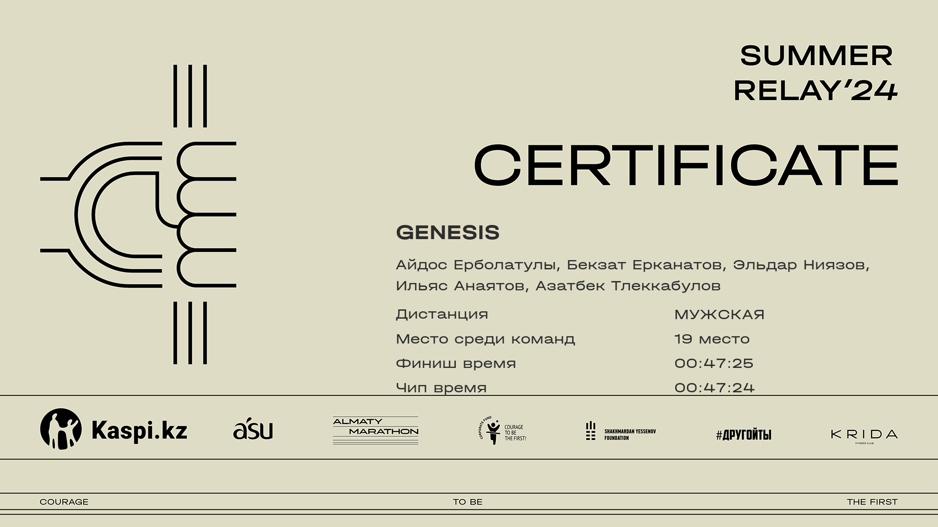 | 20 | Kaspi Run: Aleksandr Solodun, Almurat Zhilkamanov, Берик Кожамжаров, Арман Букенов, Руслан Дубинин |  | Алматы | 15 | 00:09:37.69 | 00:08:30.88 | 00:11:45.45 | 00:09:39.13 | 00:47:37.89 | 00:47:35.83 | Скачать |