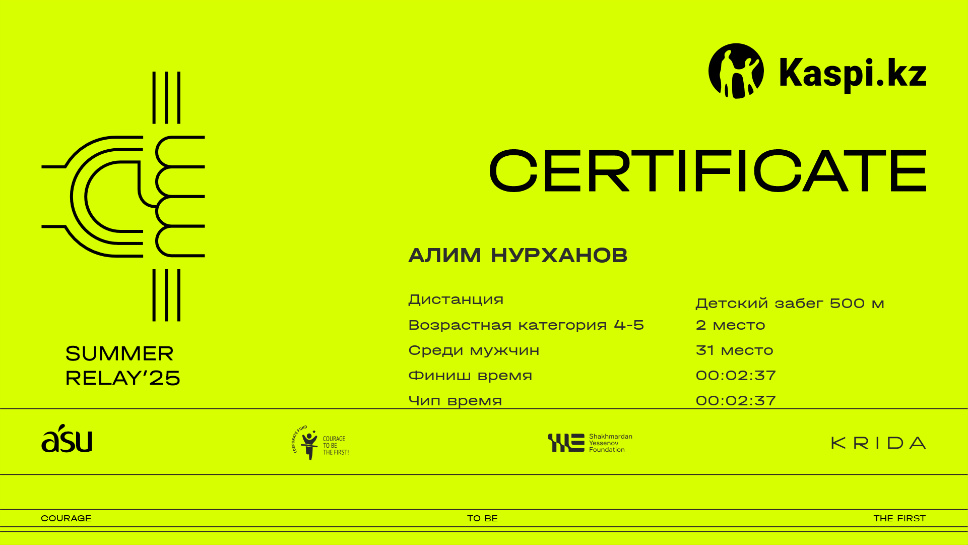 | 113 | Arsen Kozhan | ![]() | Алматы | 25 | 00:03:14.10 | 00:03:13.70 | Скачать |