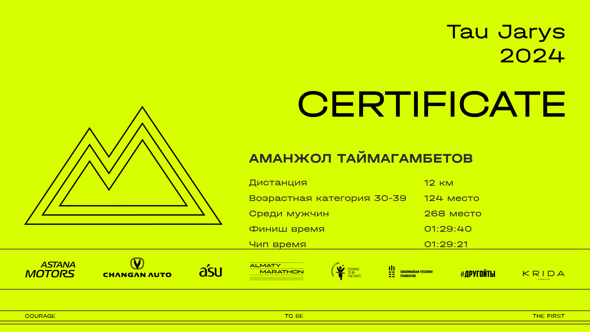 | 319 | Айдар Заурбек | ![]() | Алматы | 313 | 00:12:08.82 | 00:30:25.22 | 00:57:17.36 | 01:15:51.64 | 01:30:03.27 | 01:29:49.85 | Скачать |
