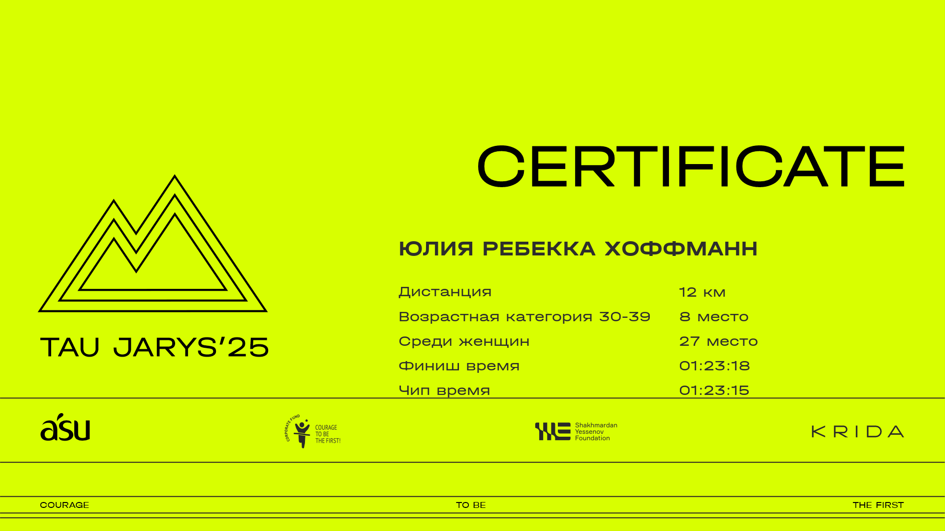 | 250 | Нурсултан Калдарбеков | ![]() | Алматы | 129 | 00:09:44.80 | 00:25:51.60 | 00:34:23.30 | 00:51:54.00 | 01:09:16.90 | 01:17:50.40 | 01:24:32.30 | 01:24:25.00 | Скачать |