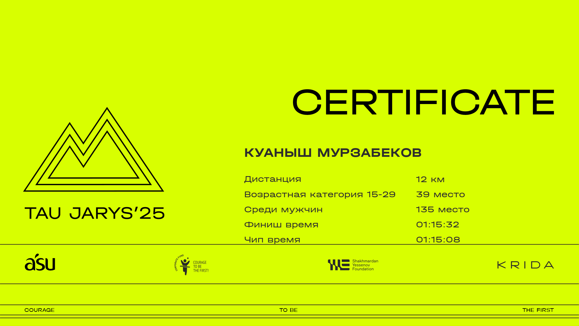 | 142 | Kazbek Serikbay | ![]() | Алматы | 483 | 00:08:21.90 | 00:22:22.80 | 00:29:14.70 | 00:46:23.40 | 01:01:36.90 | 01:08:48.60 | 01:14:48.00 | 01:14:46.30 | Скачать |