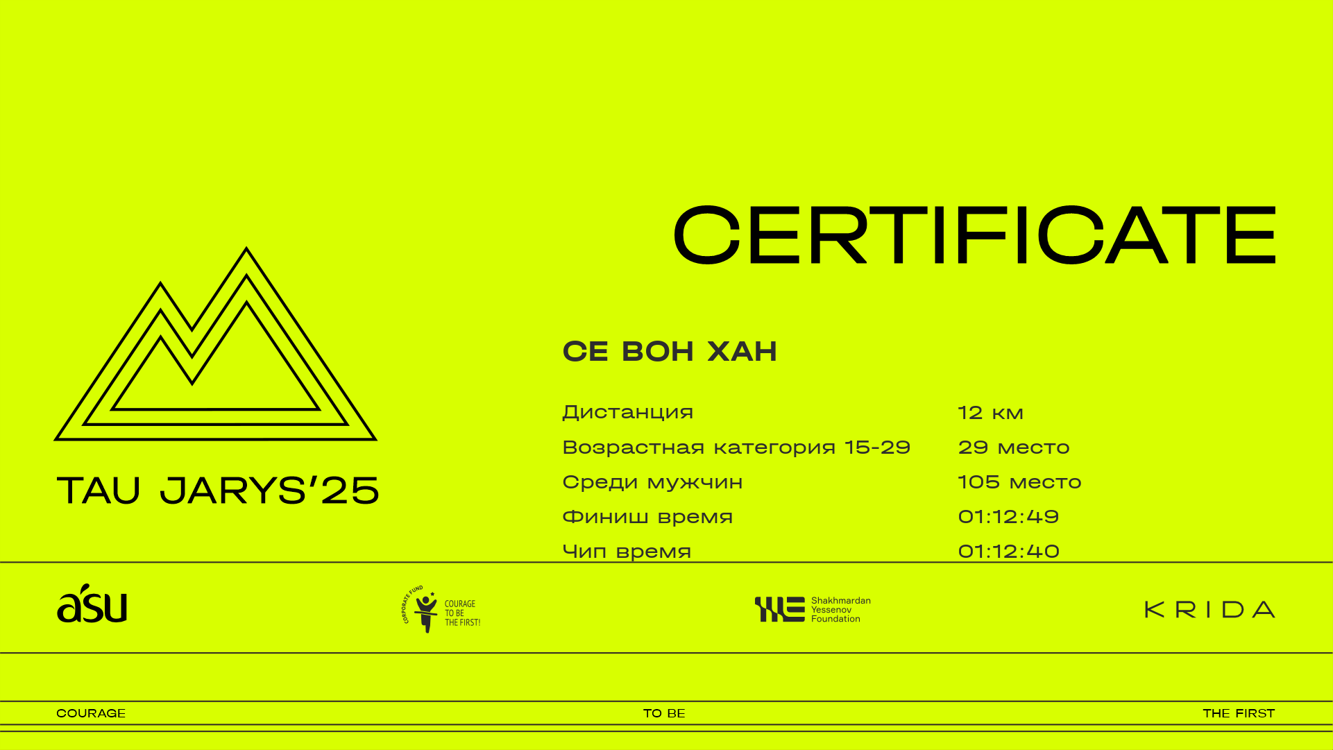 | 115 | Се Вон Хан | ![]() | Алматы | 25 | 00:08:50.20 | 00:22:51.80 | 00:30:21.40 | 00:46:02.80 | 01:00:08.00 | 01:07:09.90 | 01:12:49.30 | 01:12:40.00 | Скачать |