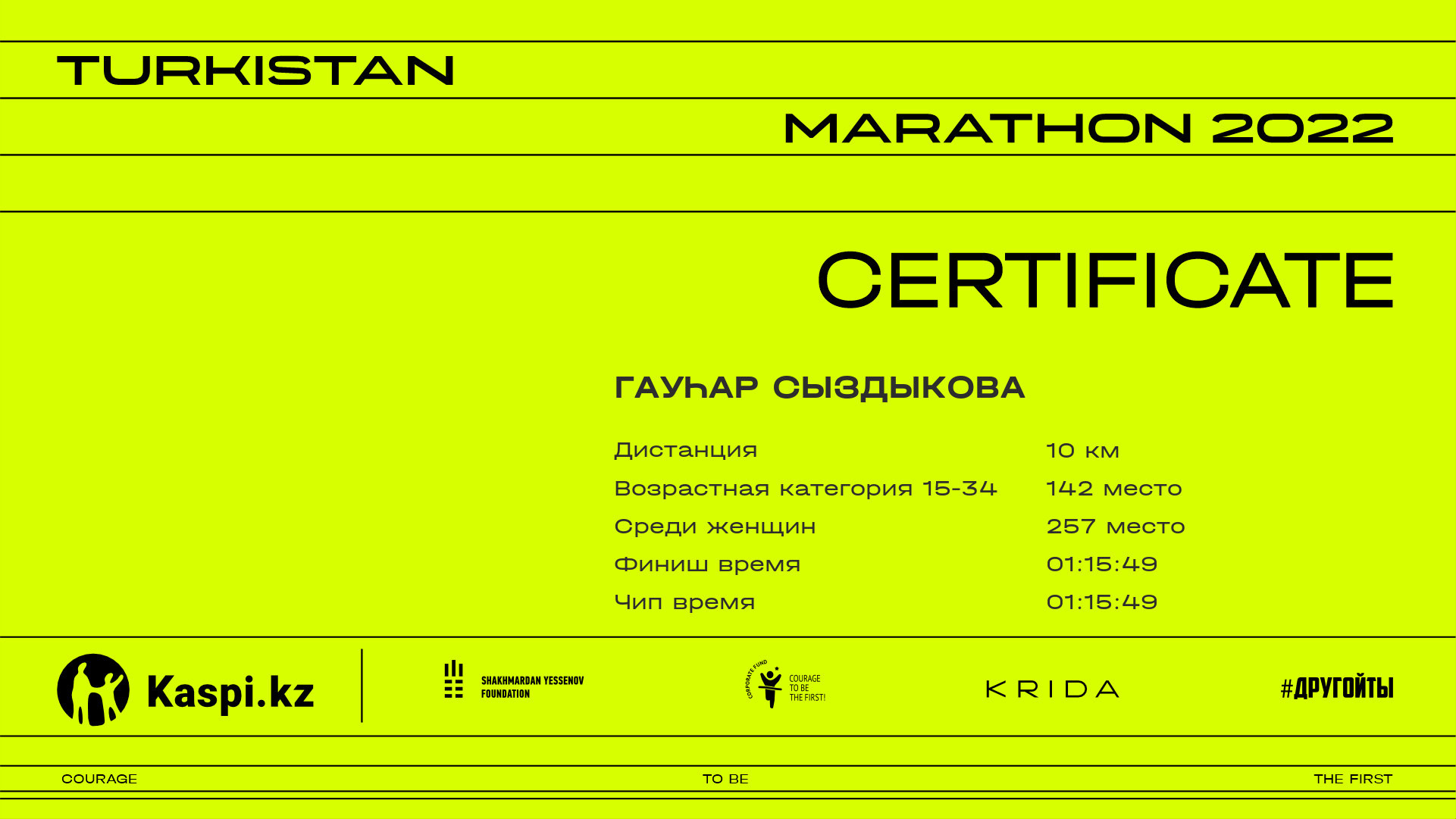 | 591 | Symbat Shadiyarkyzy | ![]() | Shymkent | 1508 | 00:36:57.15 | 01:12:58.08 | 01:12:27.07 | Скачать |