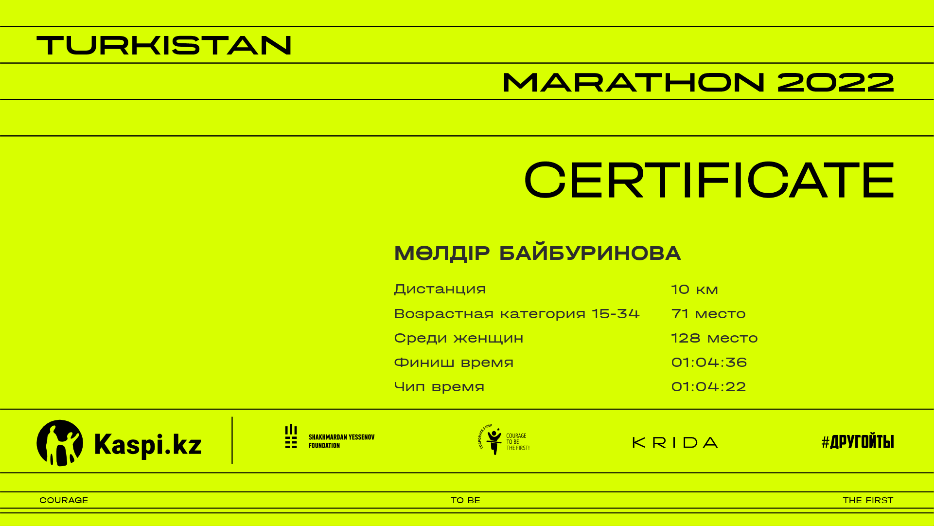 | 415 | Мөлдір Байбуринова | ![]() | Алматы | 1623 | 00:32:30.10 | 01:04:36.21 | 01:04:22.22 | Скачать |