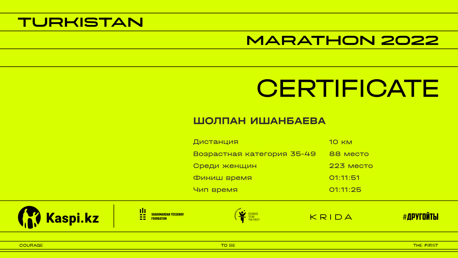 | 641 | Janel Turginbaeva | ![]() | Shymkent | 1575 | 00:38:22.86 | 01:16:32.75 | 01:15:52.48 | Скачать |