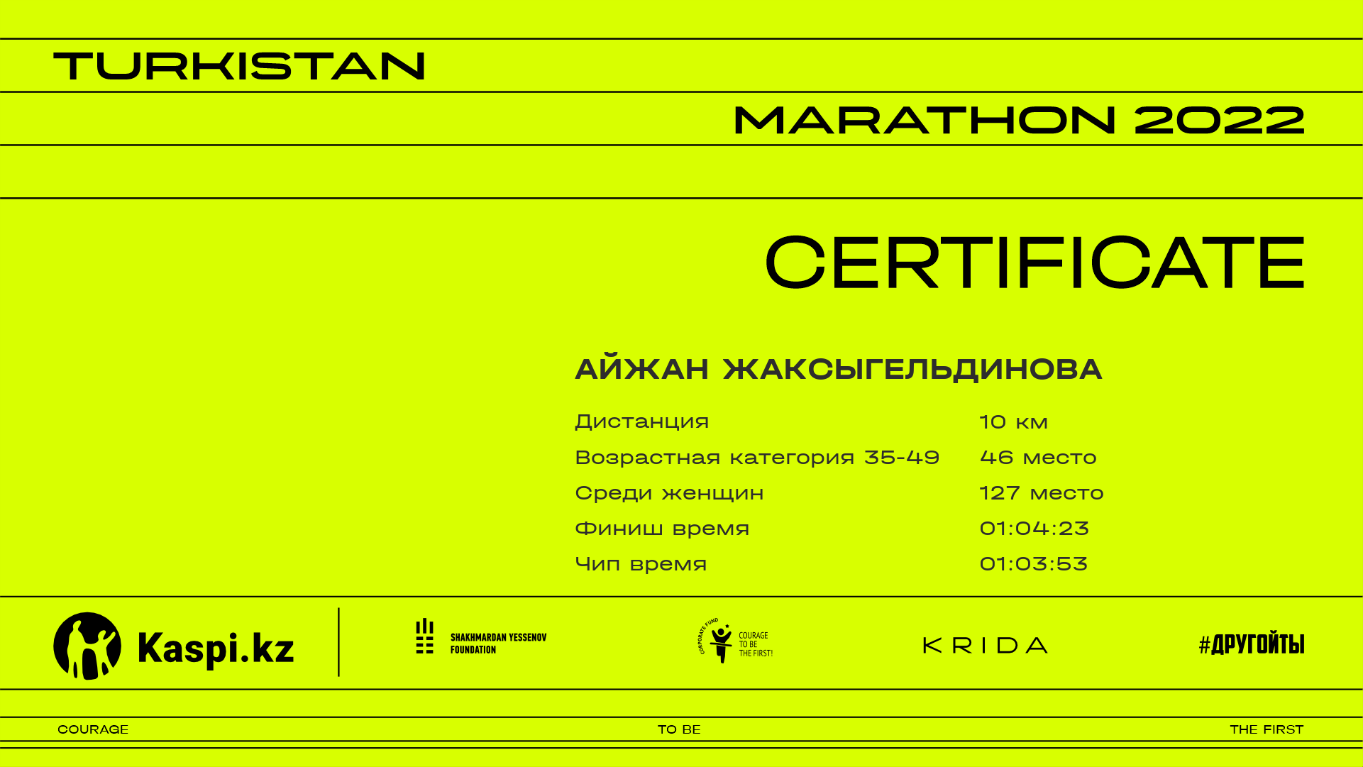 | 378 | Saniya Turanova | ![]() | Нур-Султан | 1005 | 00:30:11.77 | 01:02:48.68 | 01:02:39.36 | Скачать |