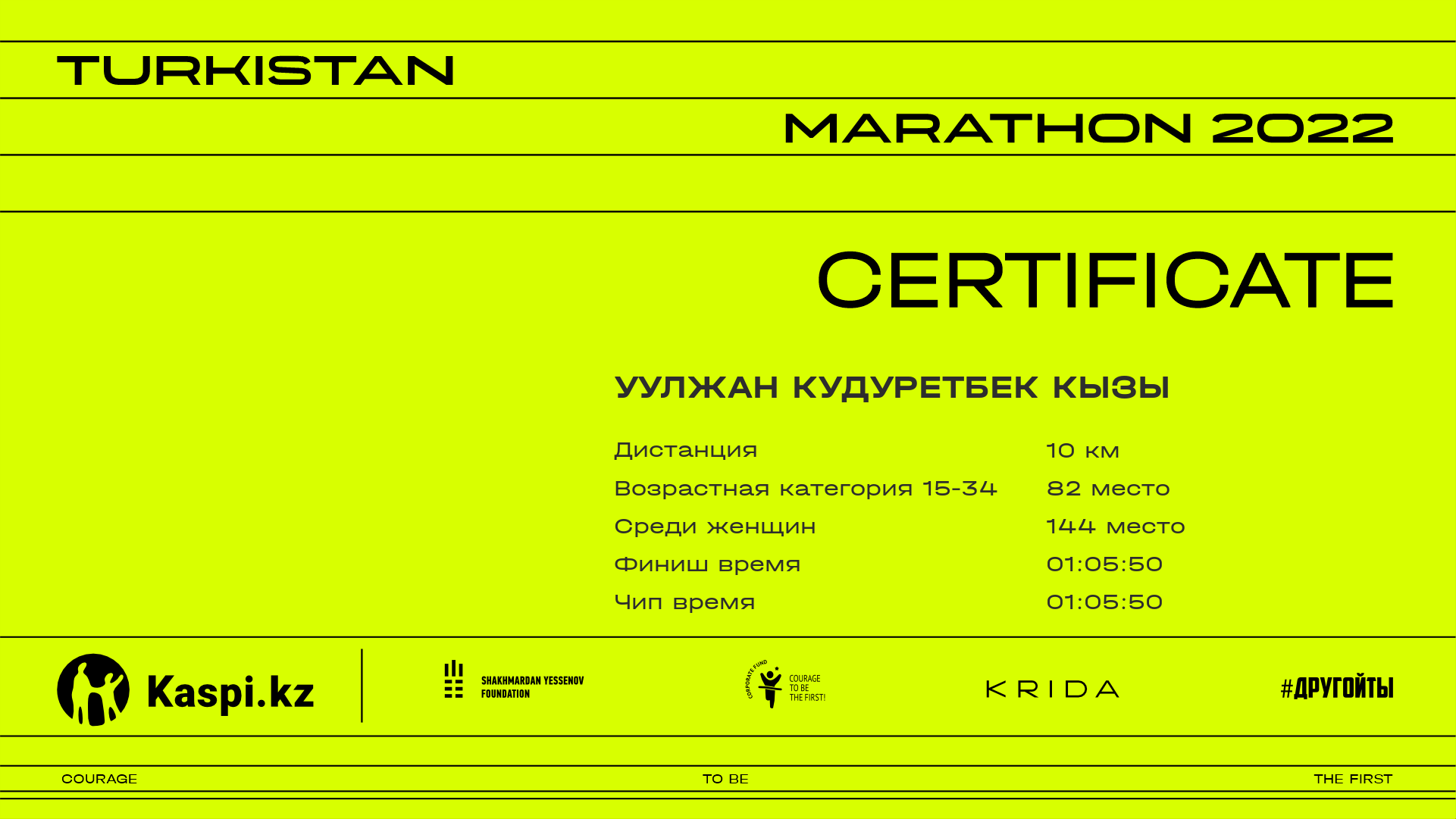 | 425 | Маржан Таджиева | ![]() | Алматы | 1067 | 00:33:01.39 | 01:05:09.14 | 01:04:53.96 | Скачать |