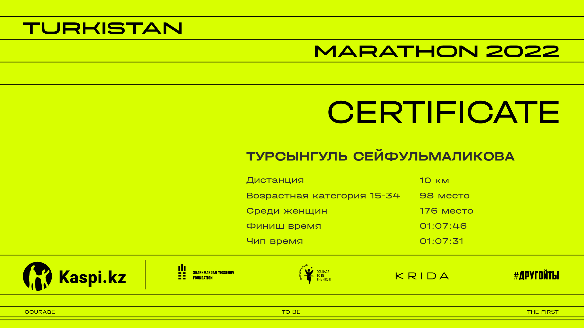 | 495 | Турсынгуль Сейфульмаликова | ![]() | Алматы | 1376 | 00:32:54.04 | 01:07:46.34 | 01:07:31.75 | Скачать |