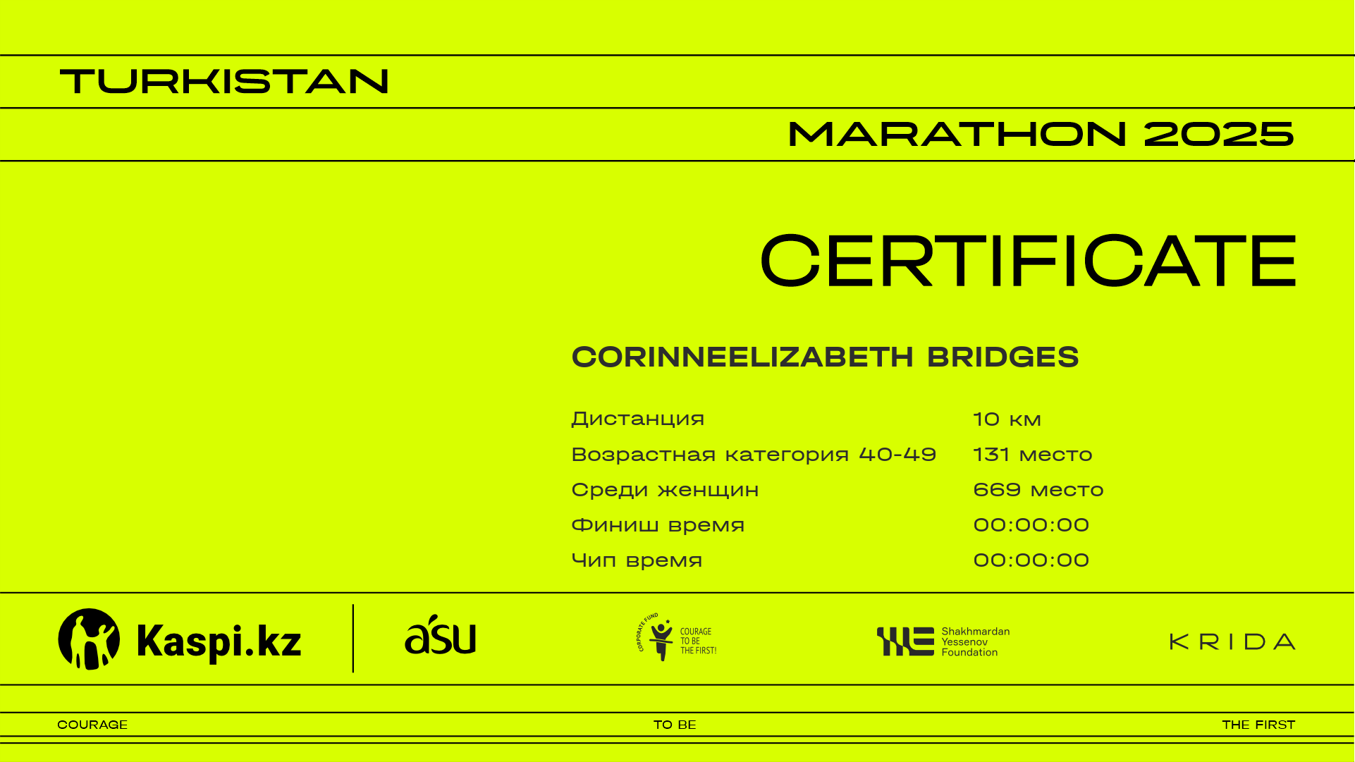 | Место | Участник | Страна | Город | Номер | 6.25 km | Финиш | Чип время | Сертификат |