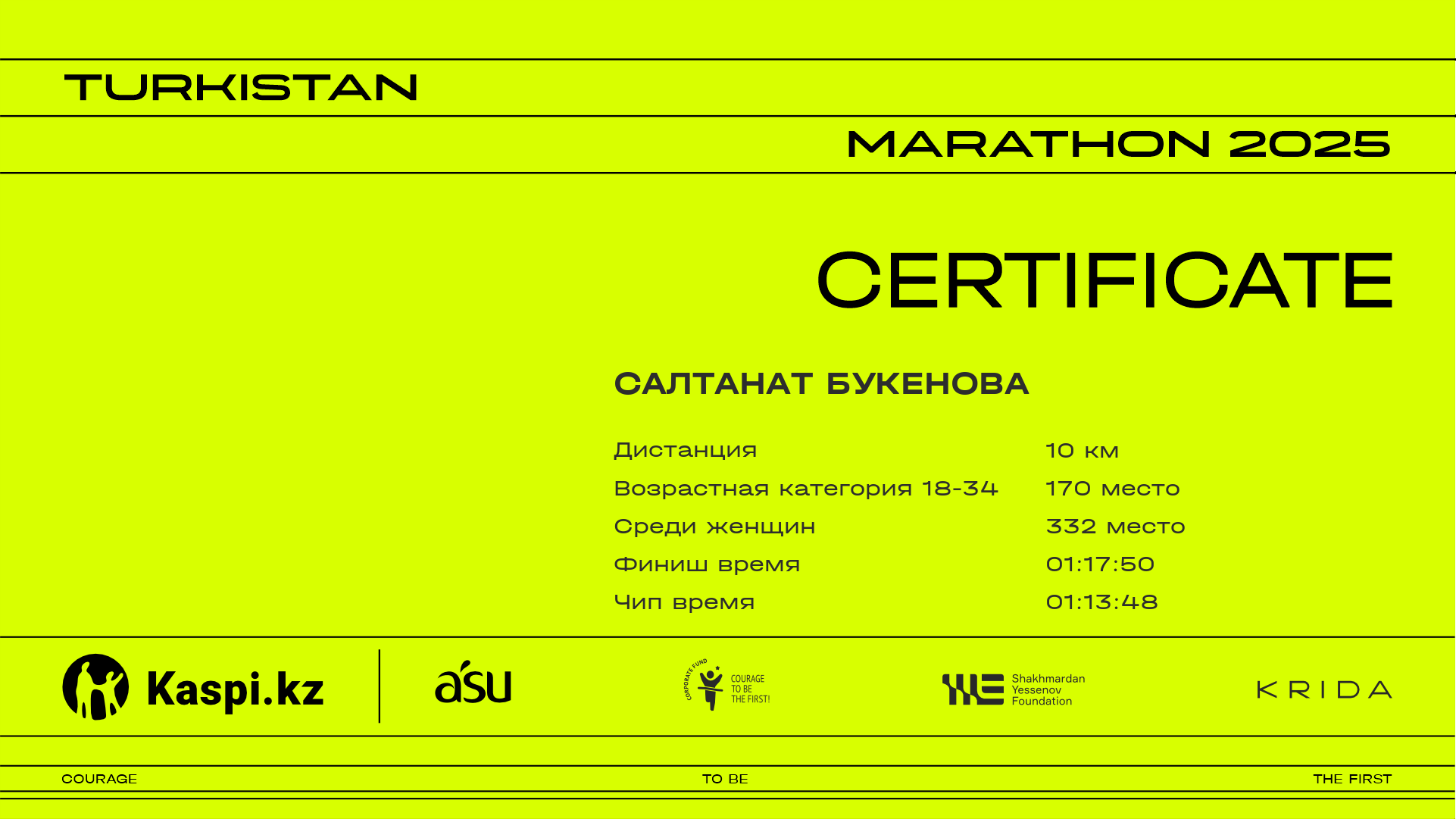 | 1117 | Снежана Ачкасова | ![]() | Алматы | 1160 | 00:58:21 | 01:34:15 | 01:33:37 | Скачать |