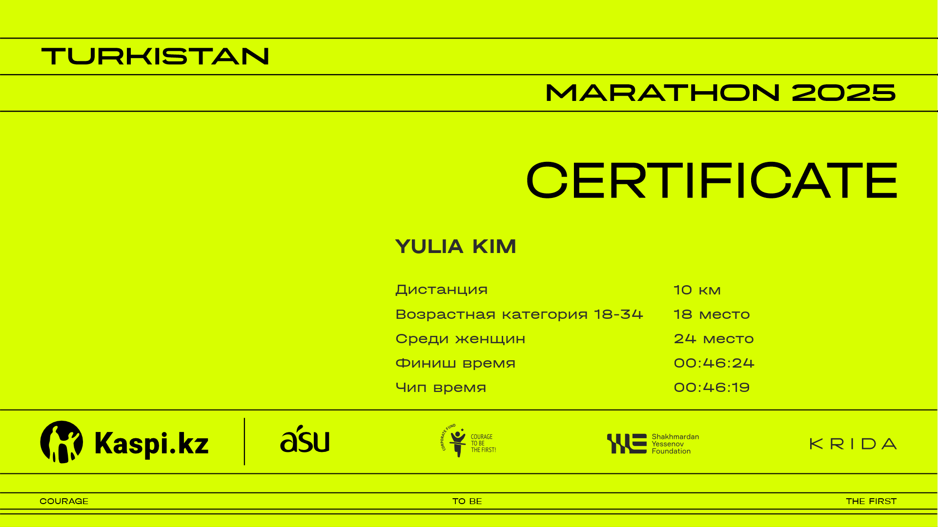| 161 | Yulia Kim | ![]() | Алматы | 1390 | 00:28:30 | 00:46:24 | 00:46:19 | Скачать |