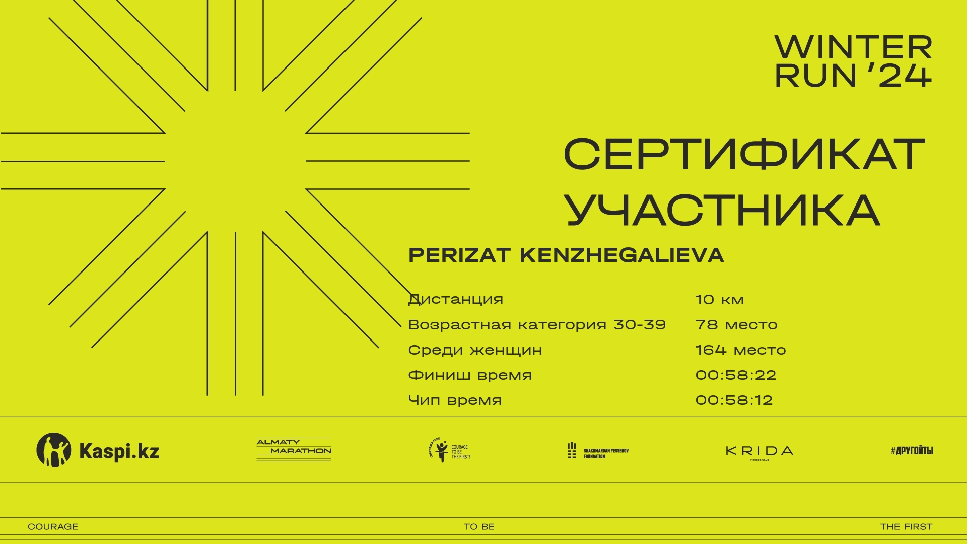 | 1310 | Akerke Baurzhan | ![]() | Almaty | 363 | 00:09:46 | 00:34:07 | 00:56:10 | 01:07:55 | 01:07:28 | Скачать |