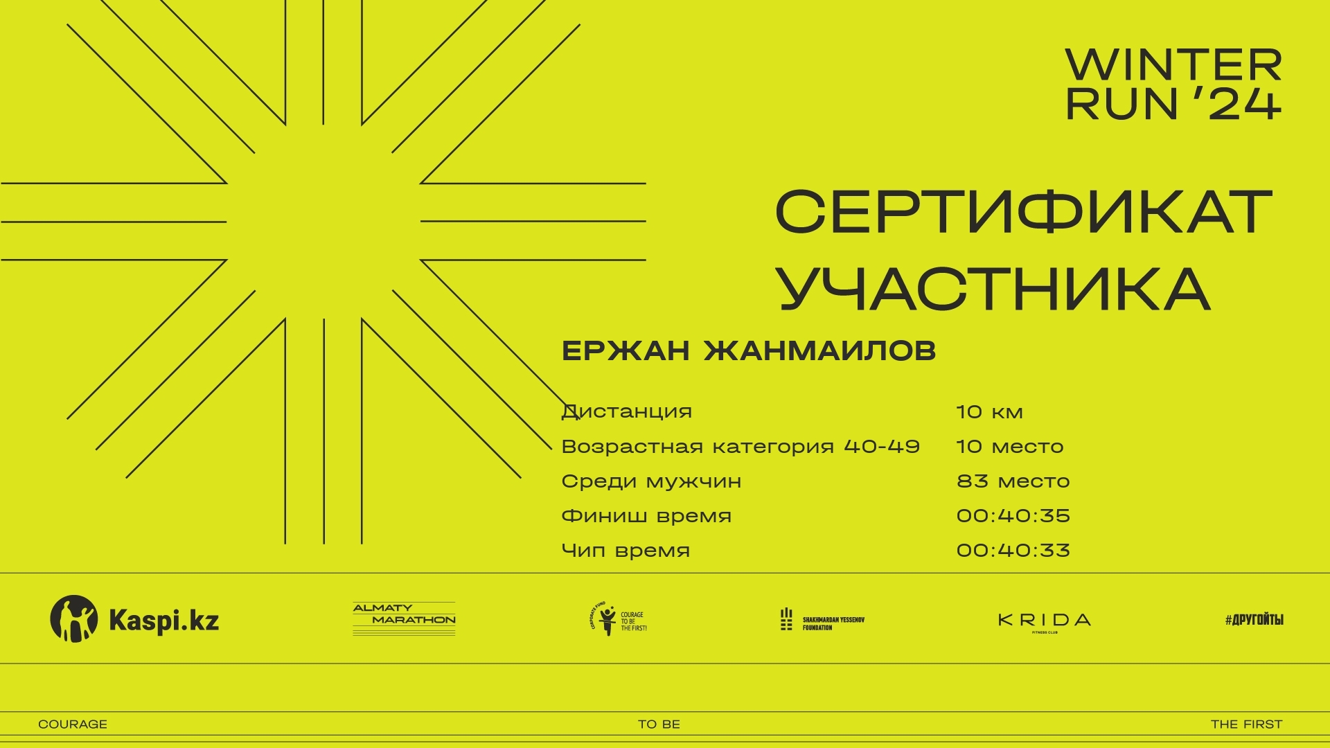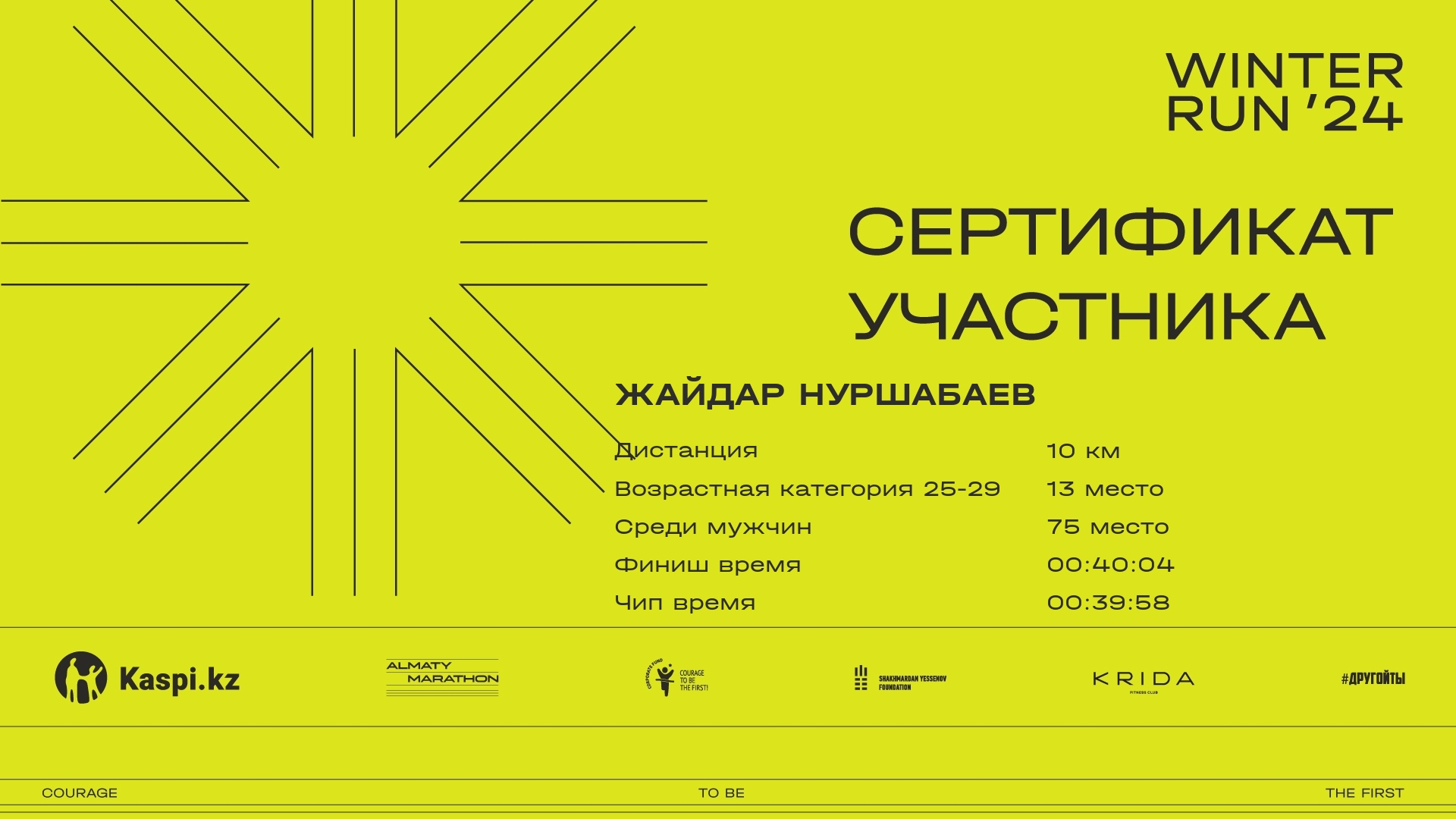 | 68 | Даян Сансызбаев | ![]() | Шымкент | 1453 | 00:05:52 | 00:20:18 | 00:33:37 | 00:39:45 | 00:39:42 | Скачать |