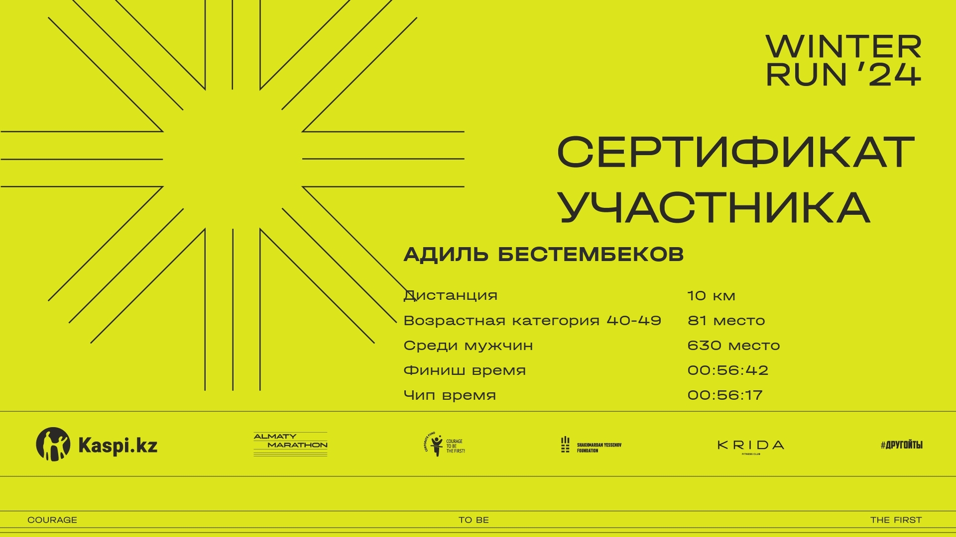 | 840 | Temirkhan Amanbayev | ![]() | Almaty | 2183 | 00:07:25 | 00:28:59 | 00:47:57 | 00:57:40 | 00:57:37 | Скачать |