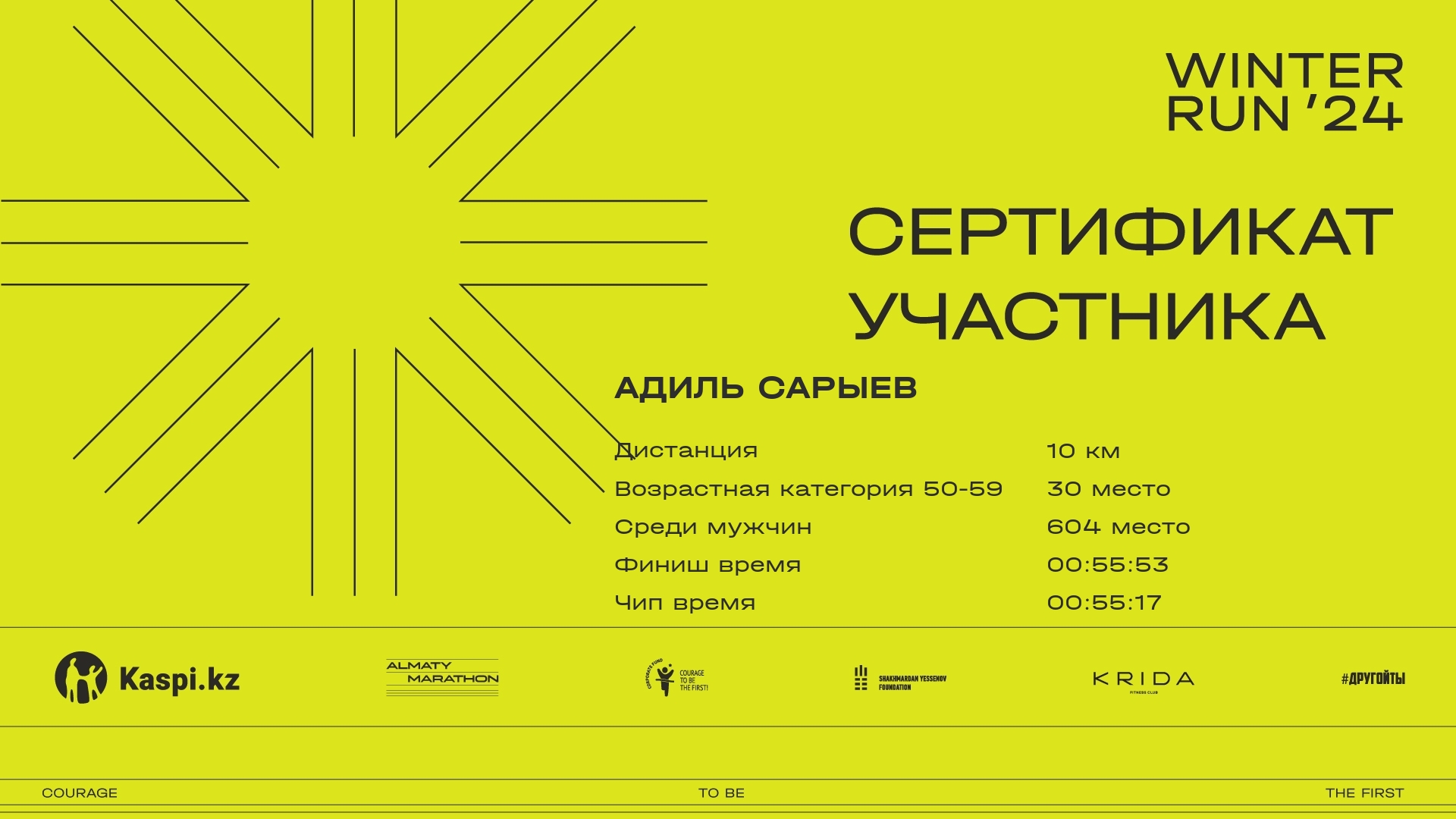 | 732 | Адиль Сарыев | ![]() | Алматы | 1963 | 00:08:53 | 00:29:46 | 00:47:27 | 00:55:53 | 00:55:17 | Скачать |