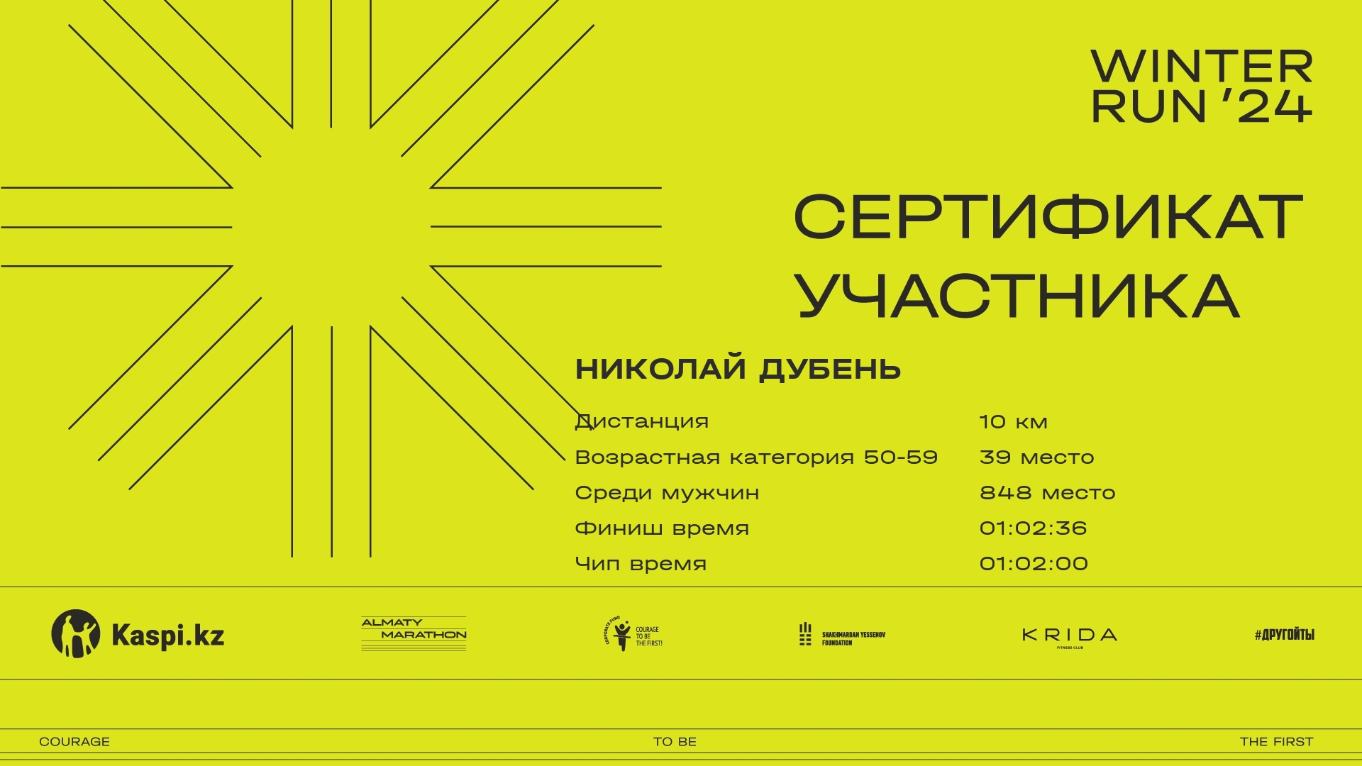 | 1084 | Николай Дубень | ![]() | Алматы | 1959 | 00:08:54 | 00:32:07 | 00:52:20 | 01:02:36 | 01:02:00 | Скачать |