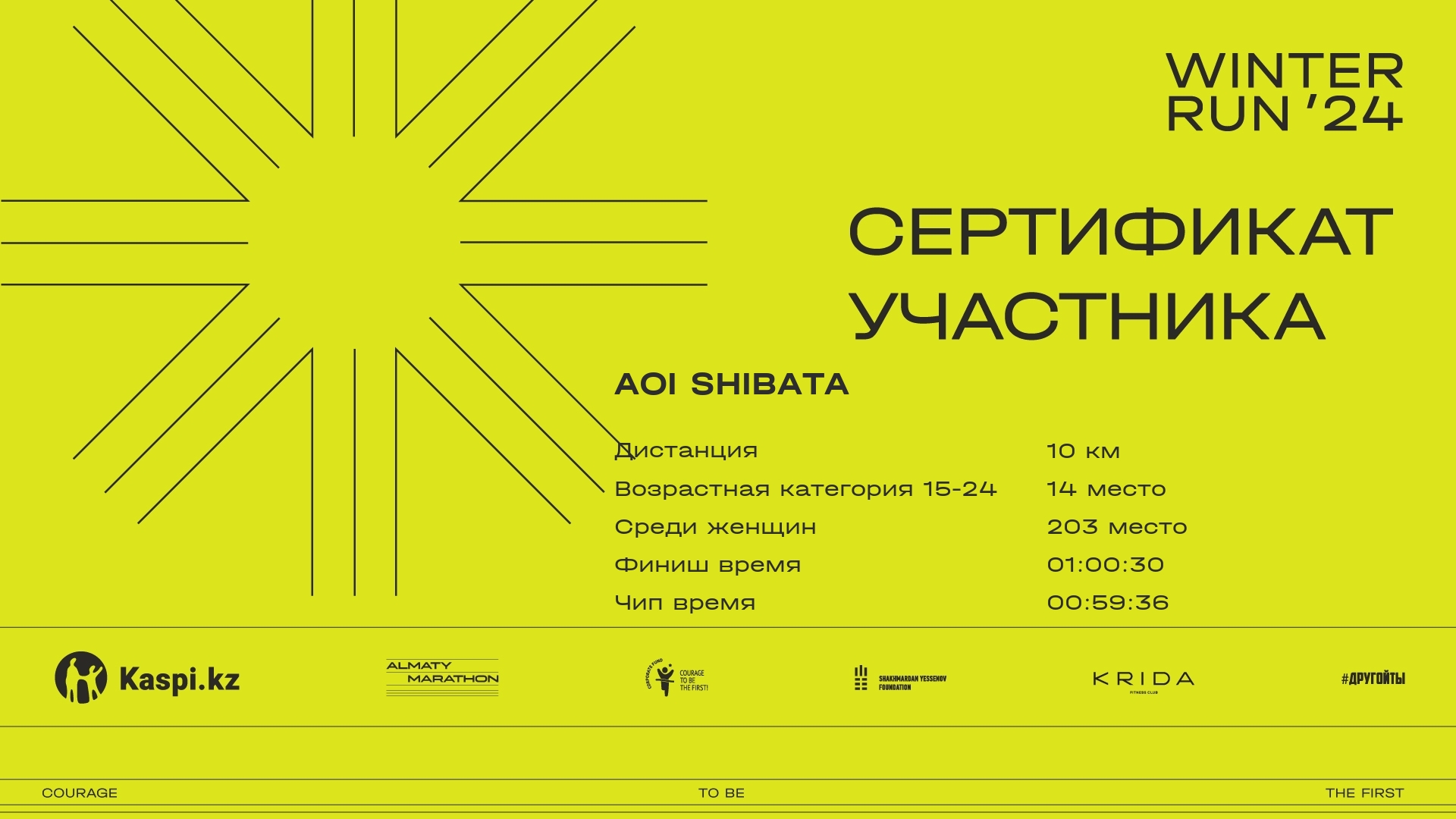 | 1713 | Alisher Kuanysh | ![]() | Almaty | 127 | 00:10:16 | 00:40:12 | 01:07:32 | 01:23:52 | 01:23:20 | Скачать |