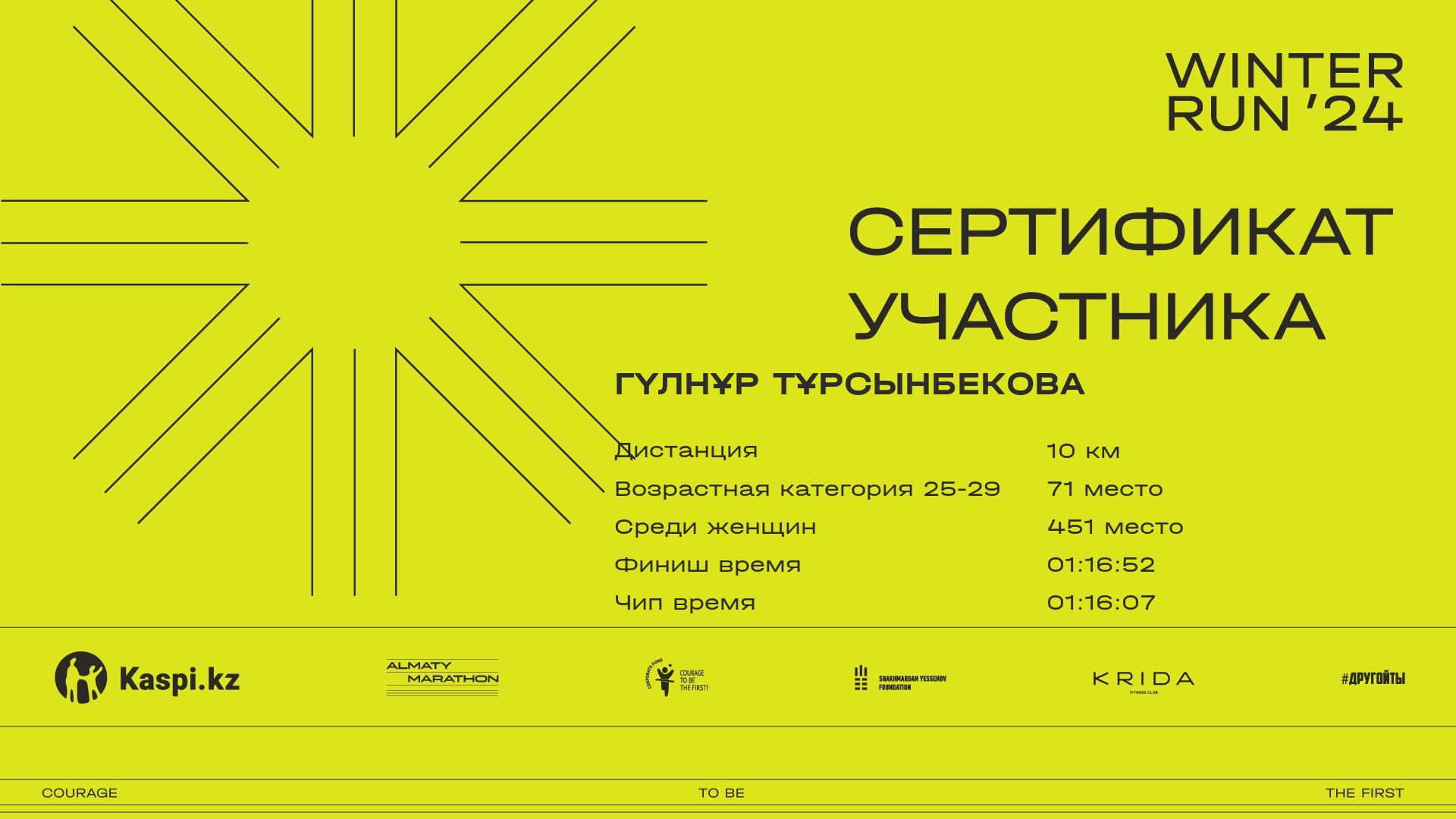 | 1574 | Temirlan Kussaiyn | ![]() | Almaty | 2027 | 00:11:30 | 00:39:12 | 01:03:32 | 01:15:32 | 01:14:17 | Скачать |