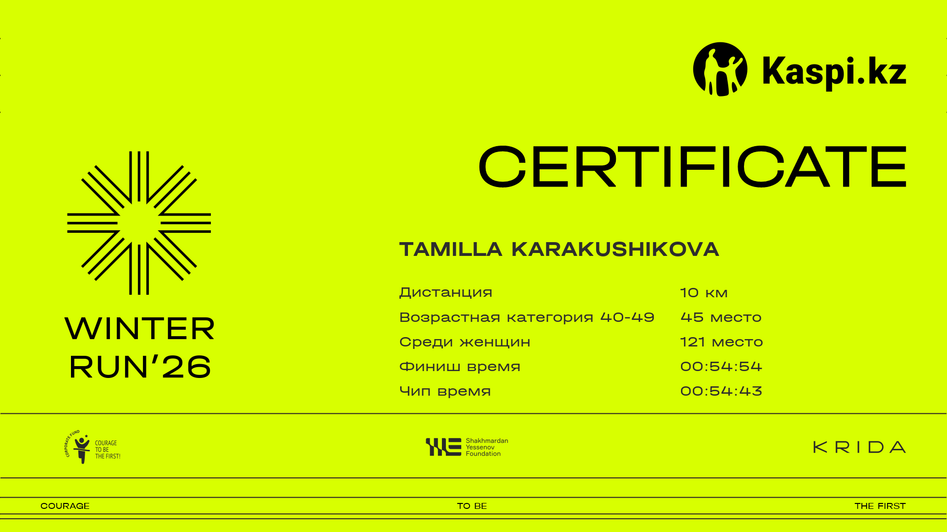 | 1895 | Yasmin Amrayeva | ![]() | Almaty | 1700 | 00:11:07.81 | 01:06:56.41 | 01:21:02.09 | 01:19:33.83 | Скачать |