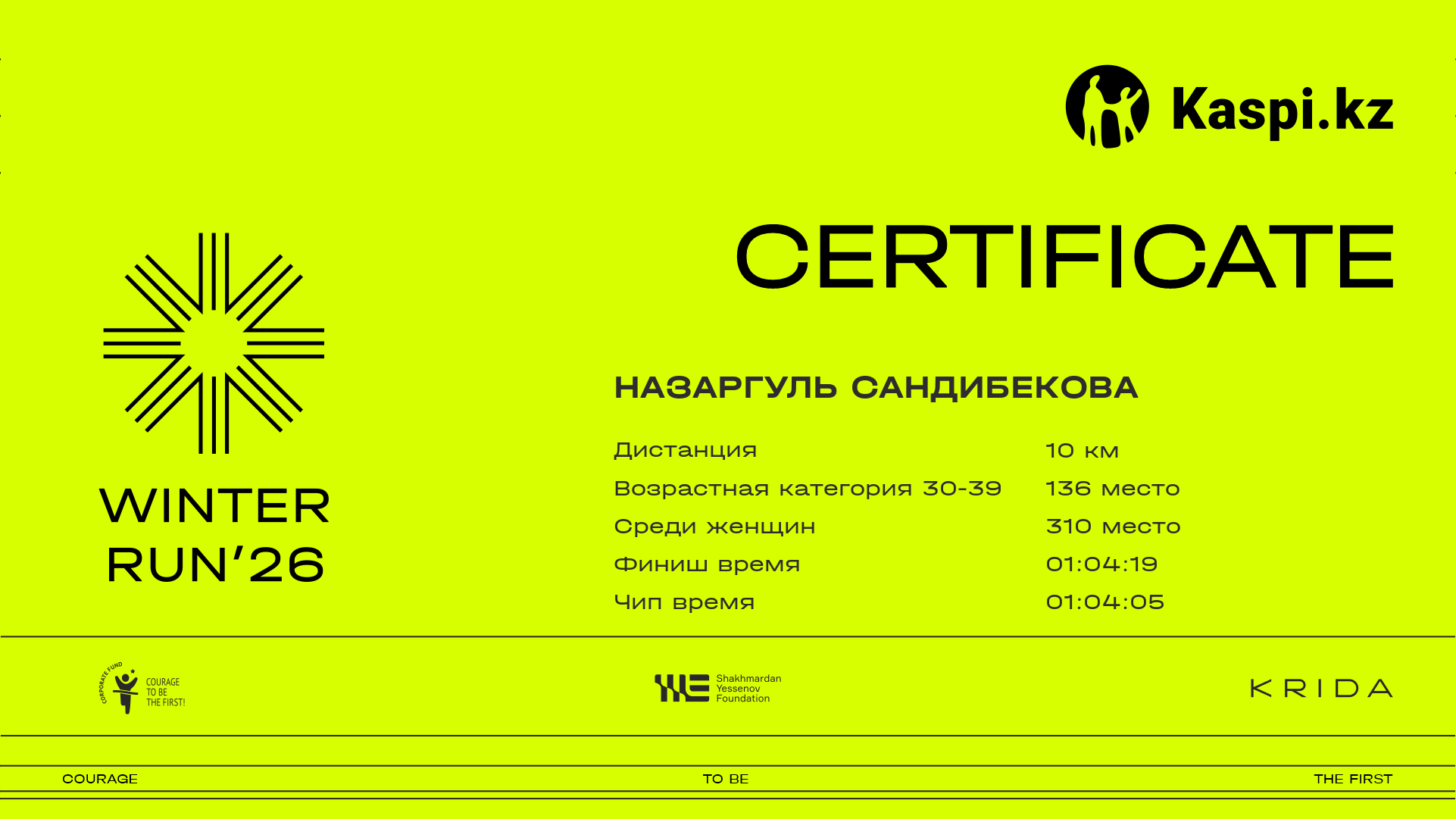 | 625 | Айгерим Аденова | ![]() | Almaty | 1716 | 00:08:17.47 | 00:27:00.85 | 00:44:35.59 | 00:52:23.38 | 00:51:55.39 | Скачать |
