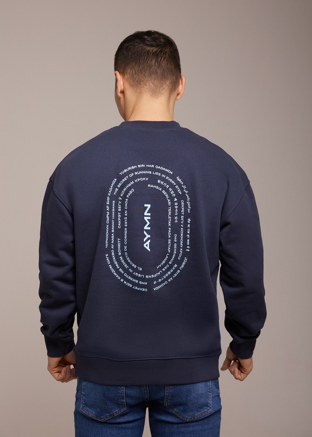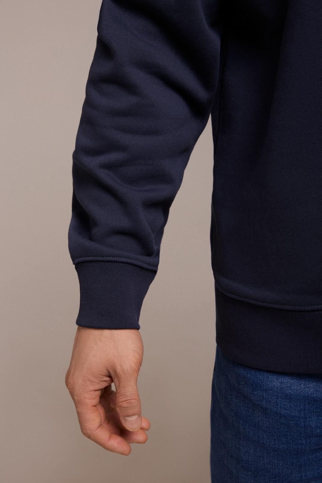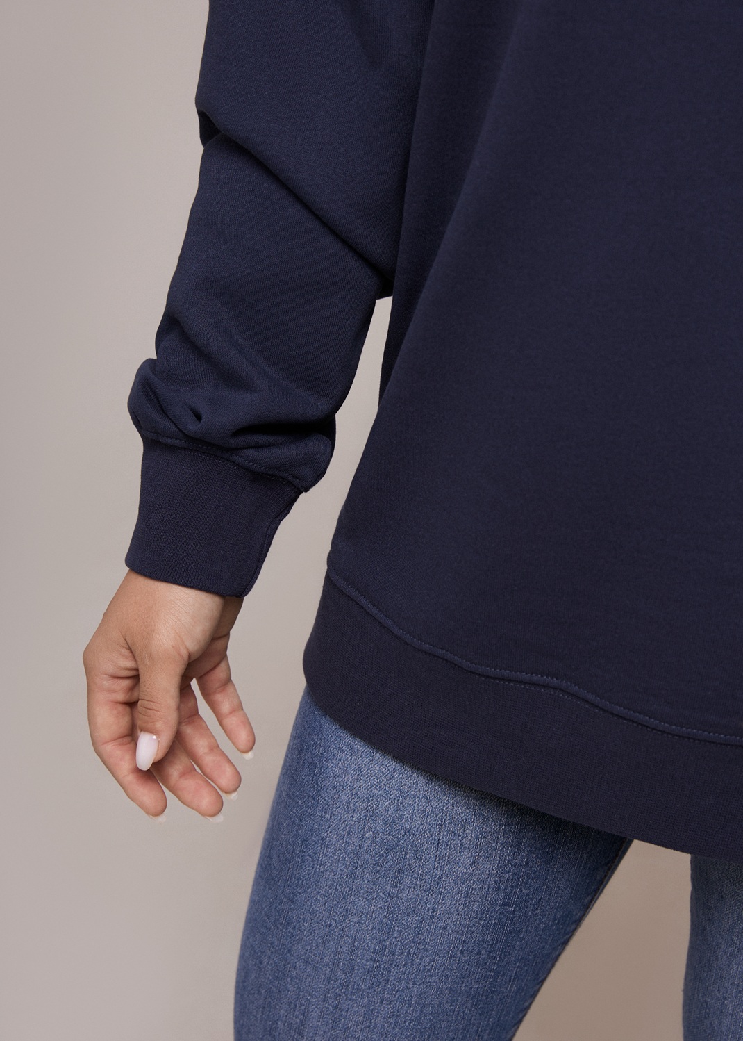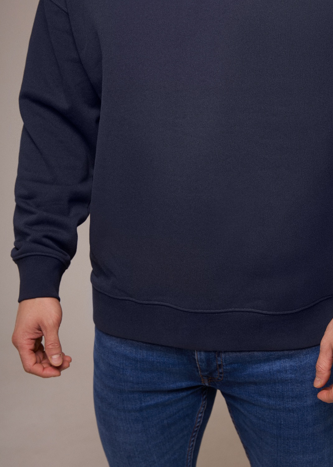 Свитшот темно-синего цвета изготовлен из высококачественного коттона, обеспечивает комфортное прилегание и не стесняет движений.